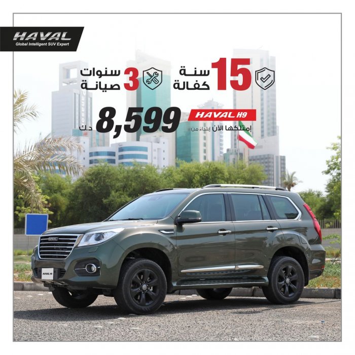 سيارة هافال H9 الجديدة كلياً بسعر يبدأ من 11,360 دينار كويتي إنعم براحة البال مع 15 سنة كفالة و 3 سنوات صيانة!